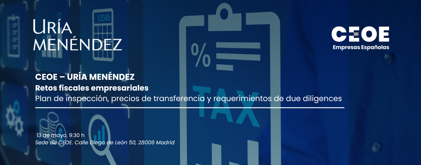 CEOE y URÍA MENÉNDEZ, tienen el placer de invitarle a la jornada “Retos fiscales empresariales: Plan de inspección, precios de transferencia y requerimientos de due diligence” que se celebrará el próximo 13 de mayo a las 9h30 en la sede de CEOE (Calle Diego de León, 50 – Madrid).