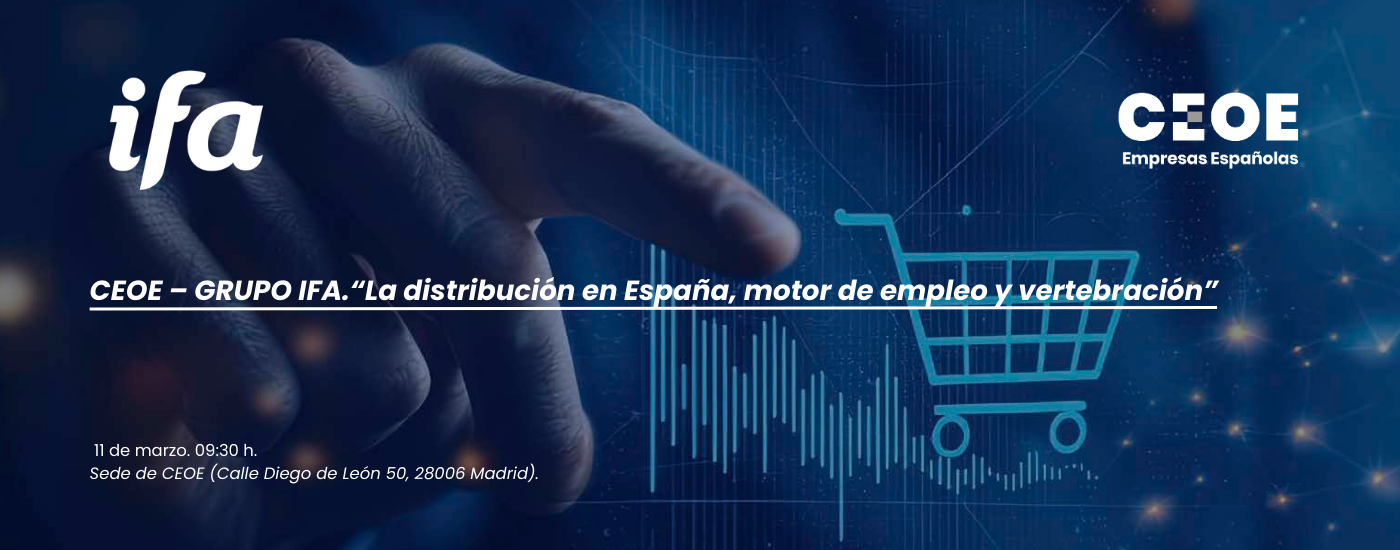 CEOE e IFA, tienen el placer de invitarle a la jornada “La distribución en España, motor de empleo y vertebración” que se celebrará el próximo 11 de marzo a las 09h30 en la sede de CEOE (Calle Diego de León, 50 – Madrid).